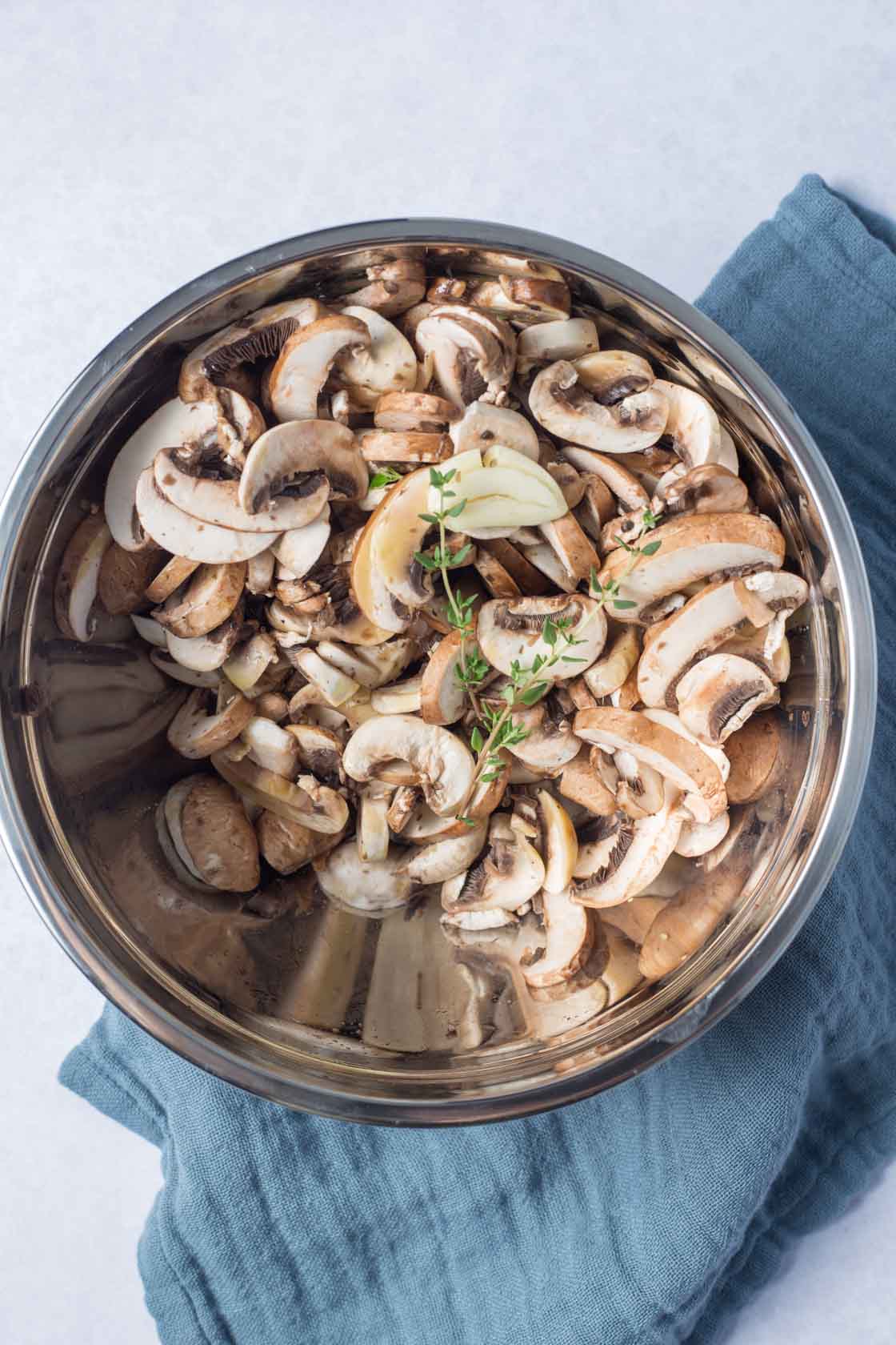 - Wash pat dry and slice all mushrooms Put them into a bowl along with a pinch of salt, pepper, the garlic, thyme and coat with olive oil. Transfer to baking tray and roast in oven for 20 /25 mins until the start to crisp up